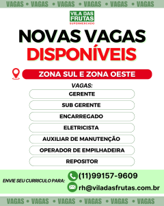 O Vila das Frutas Supermercado anunciou a abertura de novas vagas de emprego em unidades localizadas nas zonas Sul e Oeste da capital paulista. As oportunidades são voltadas para profissionais com experiência no setor supermercadista e em áreas operacionais, reforçando o quadro de colaboradores da rede.