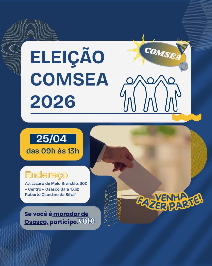 A Prefeitura de Osasco, por meio da Secretaria Executiva de Segurança Alimentar e Nutricional, Sustentabilidade e Inovação Social (SESAN), promove, neste sábado, 25 de abril de 2026, a eleição para composição do Conselho Municipal de Segurança Alimentar e Nutricional (COMSEA), instância fundamental de participação social das políticas públicas de segurança alimentar, combate à fome e promoção da alimentação adequada no município. A votação ocorrerá das 9h às 13h, na Sala Osasco (Sala Luiz Roberto Claudino da Silva), situada na Avenida Lázaro de Melo Brandão, 300 – Centro.
